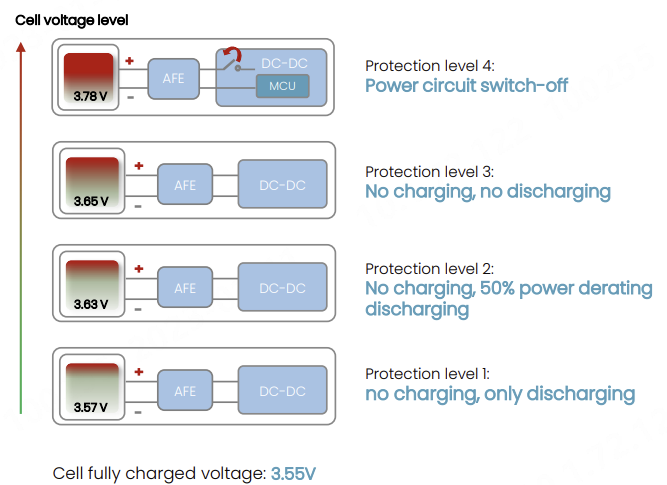 Otros fabricantes requieren 25 celdas de 100Ah para alcanzar la misma capacidad de 8kWh. Esto se traduce en una tensión del sistema de hasta 91.25V, lo que plantea desafíos significativos en términos de seguridad durante las operaciones de mantenimiento y en el reemplazo de baterías.